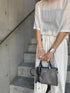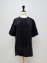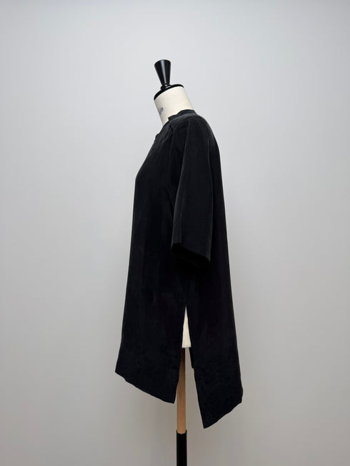 形は至ってシンプルでも、首周りの浅めのラインと長めの袖、縦ラインを強調するシルエット、さらに生地の落ち感がミニマムで洗練された印象。