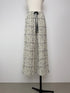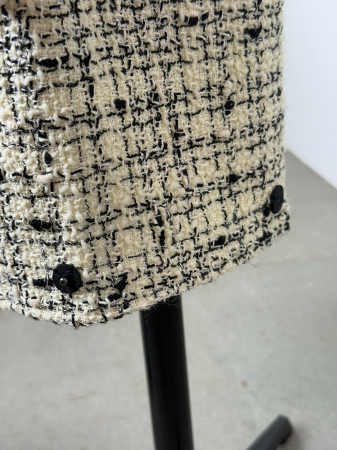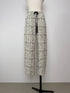様々な種類の糸を織り交ぜたファンシーな表情が、かっちりしすぎないラフでこなれた印象。ウエストゴムの力の抜けたスタイルと、ツイードのきちんと感とのバランスが良く、グログランリボンが効いている。裾にはくるみボタンがついているので、裾を絞ってシューズとのバランスを楽しんでほしい。