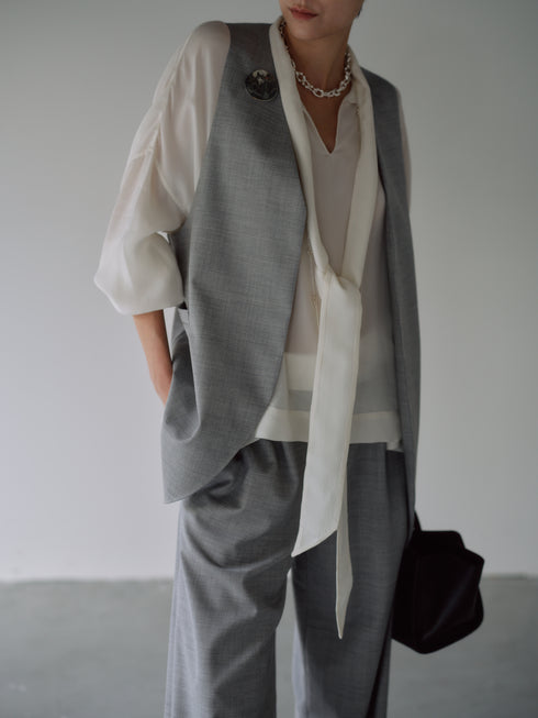 定番シルクウールの上質生地を使用したしなやかでクールな印象のベスト。フロントはあえてボタンも何もなくスッキリさせ、バックスタイルはベルトが効いたデザイン。